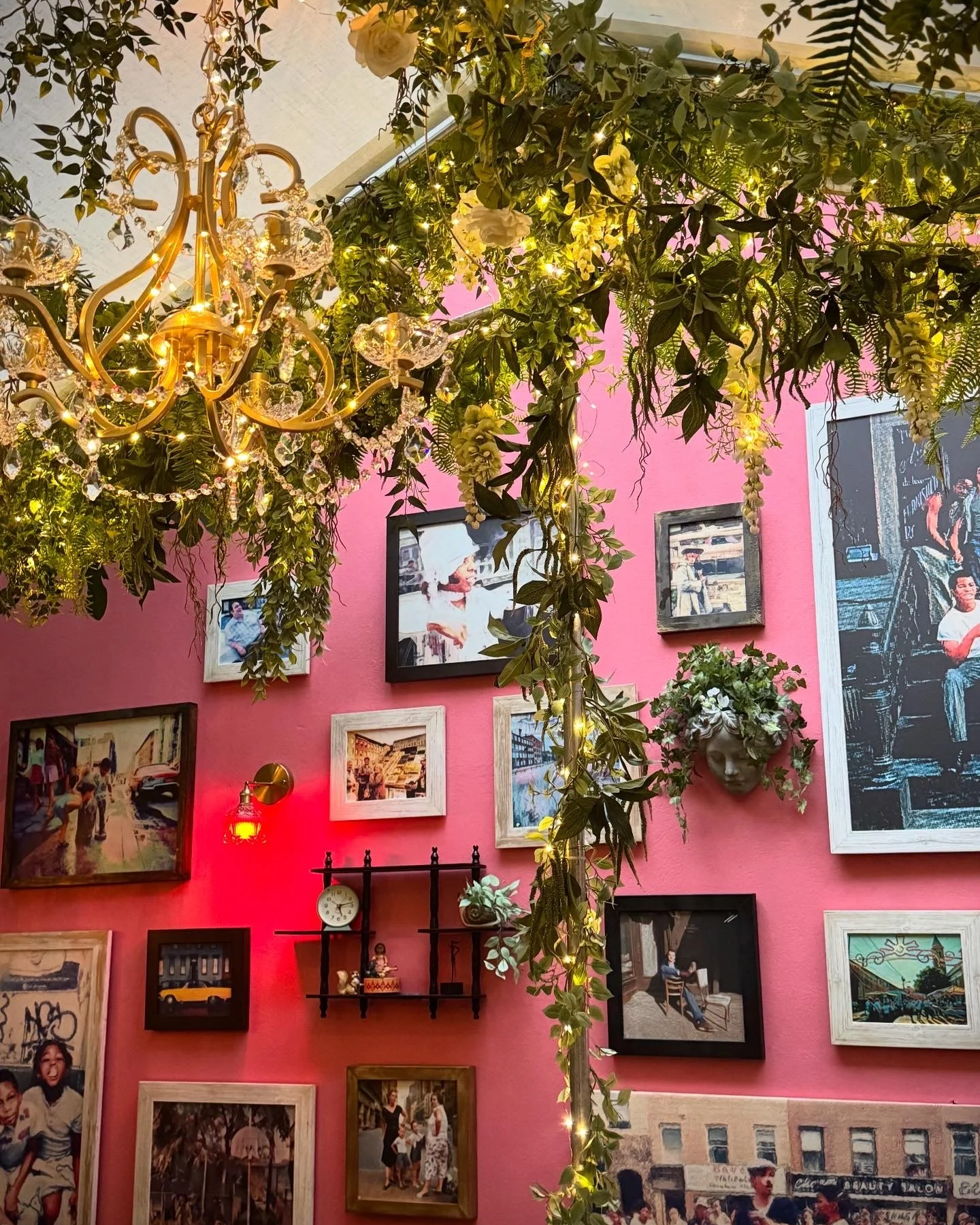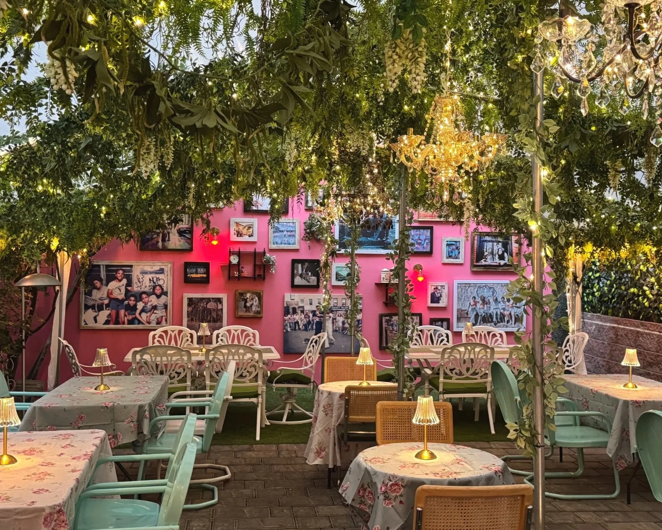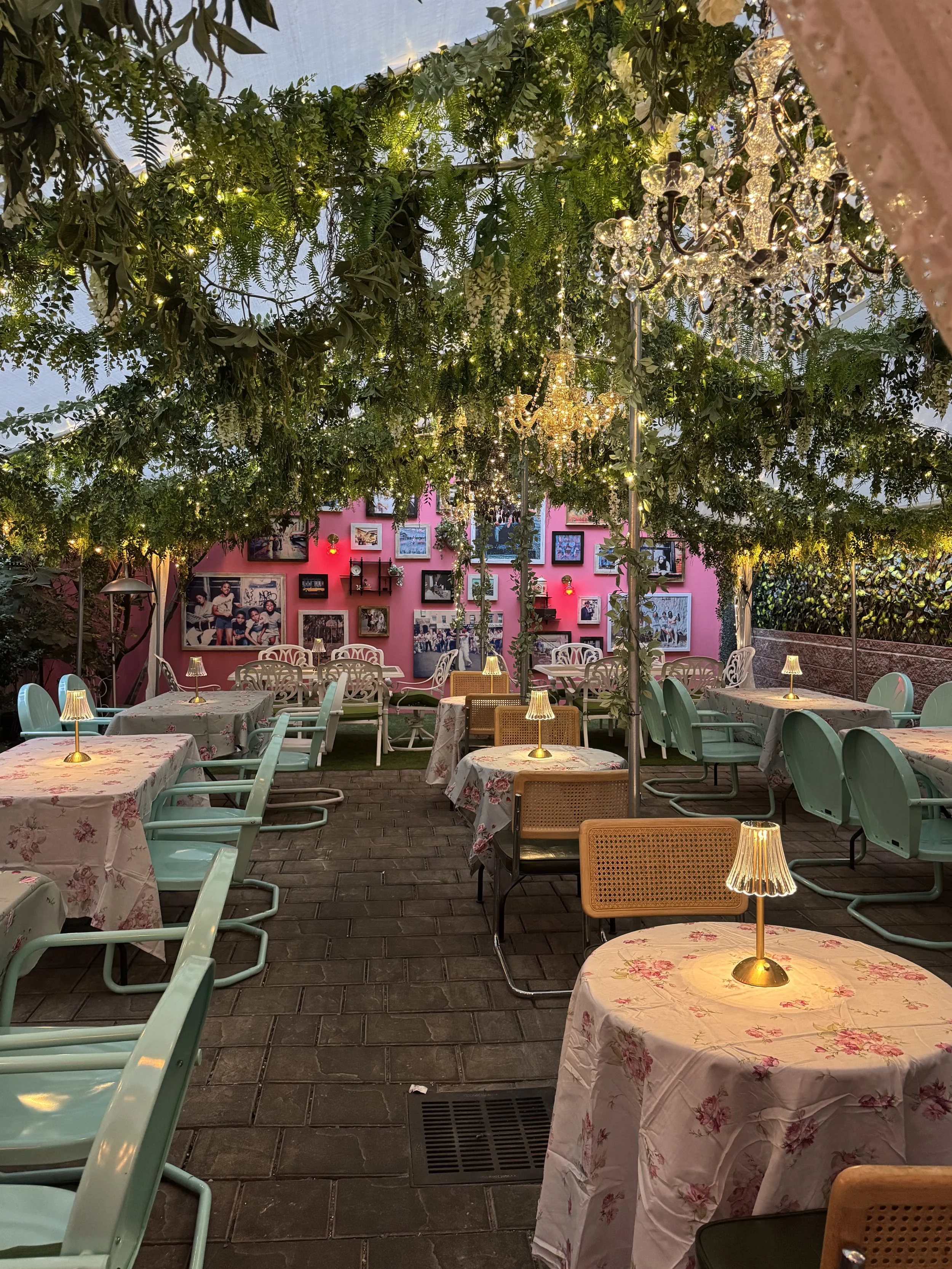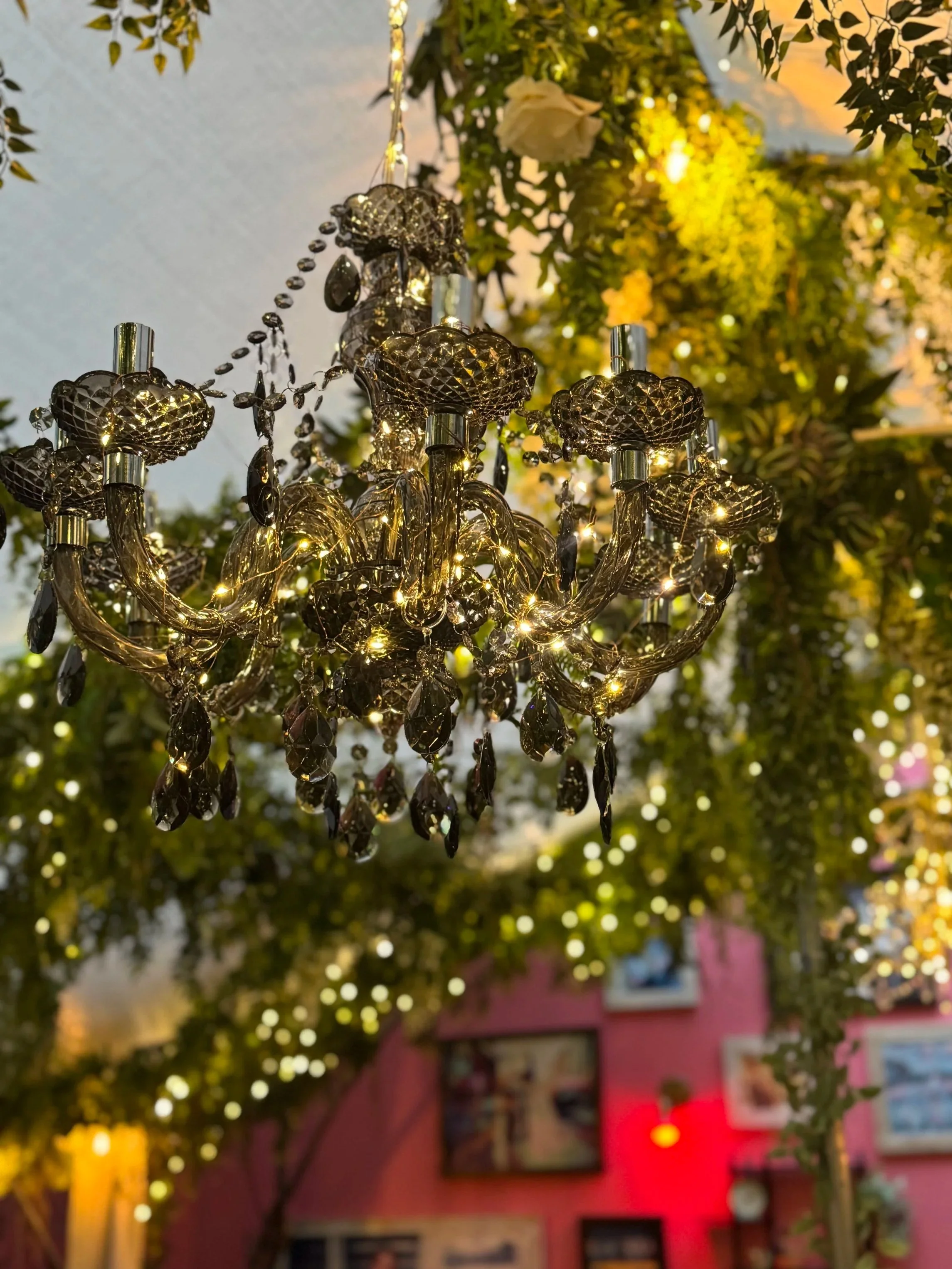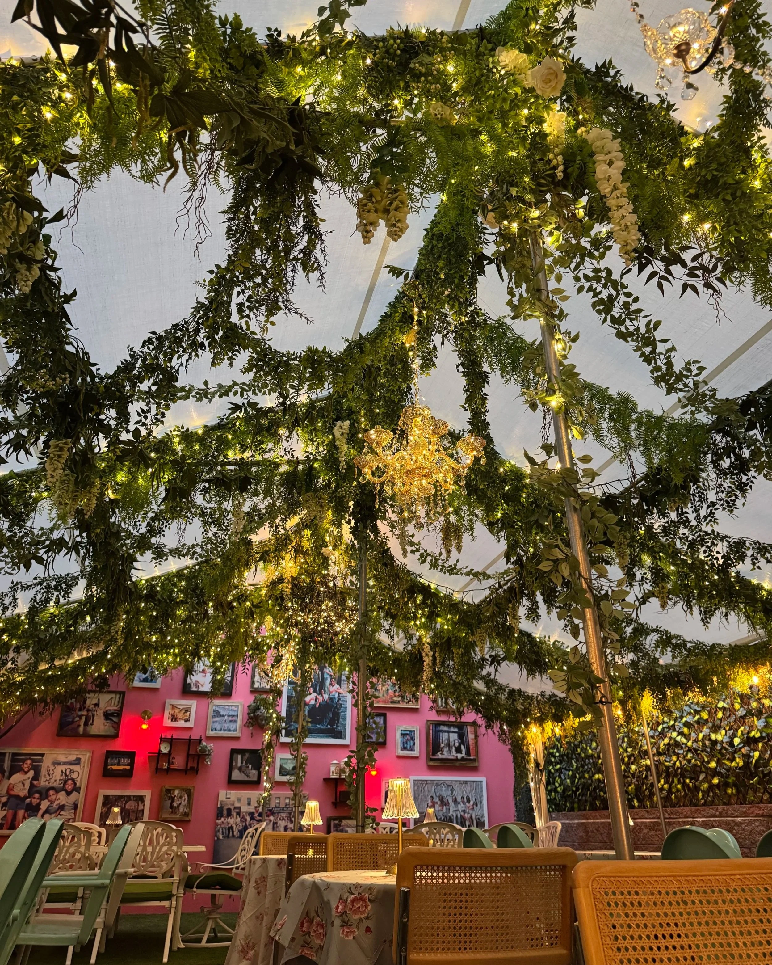 rransforming the tented patio with layered greenery suspended overhead, twinkle lights, and an unexpected mix of chandeliers to create an atmosphere that felt lush, whimsical, and slightly overgrown in the best way.