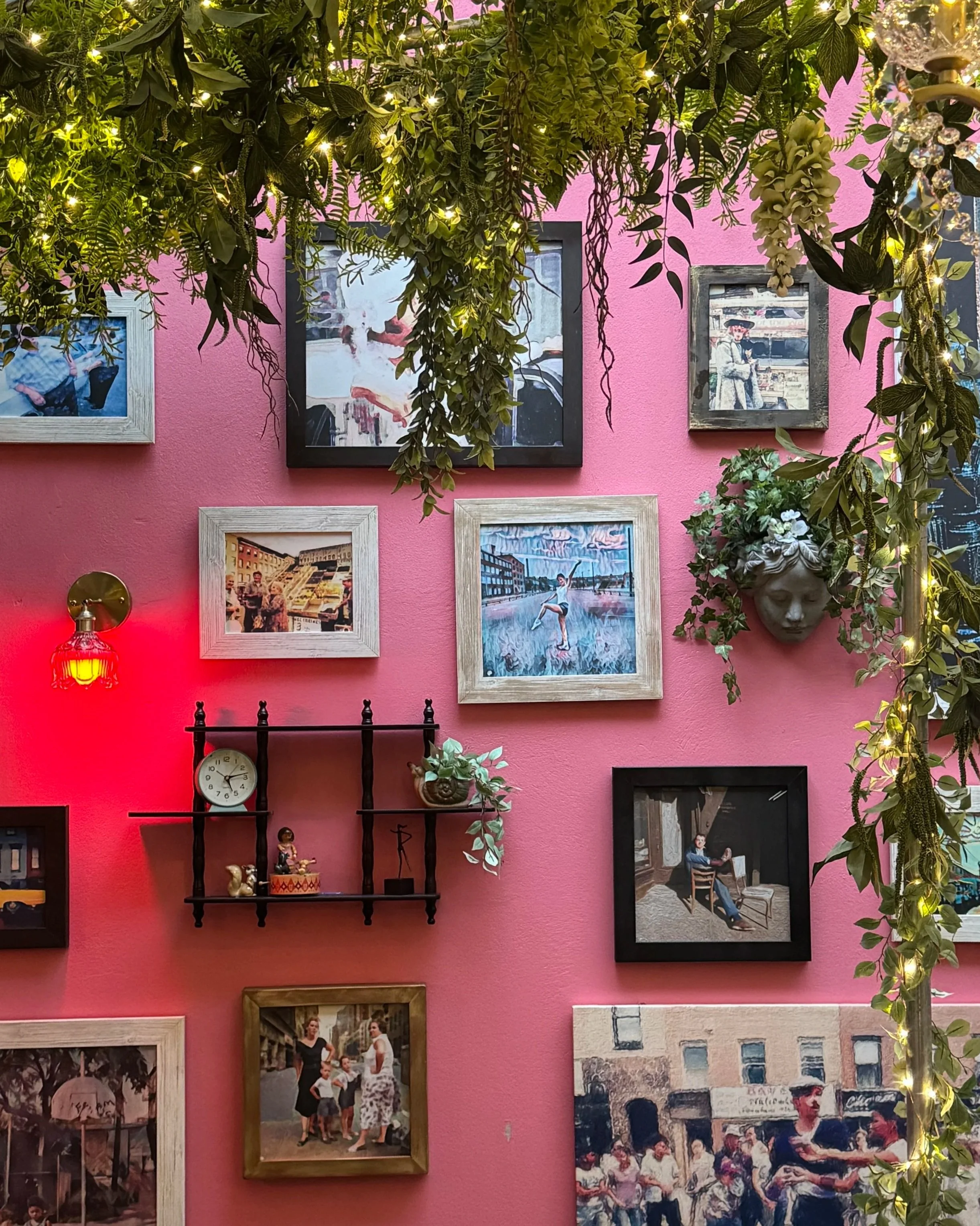 To complete the space, we transformed photography the owners loved into antique-style oil portraits and curated a gallery wall accented with sconces, shelves, and collected vintage objects — from figurines to retro radios — tying the entire experience together in a way that feels immersive, personal, and transportive.
