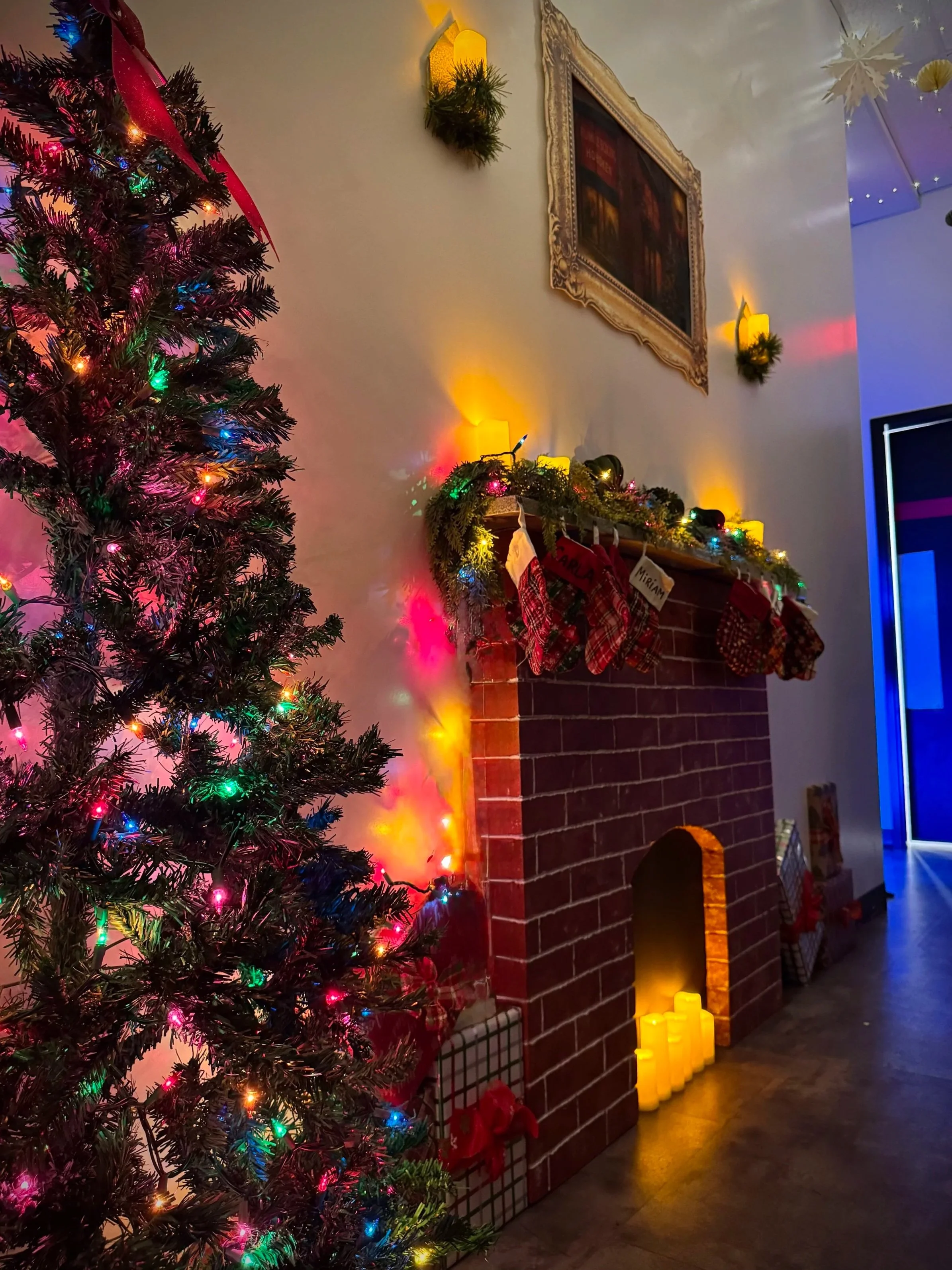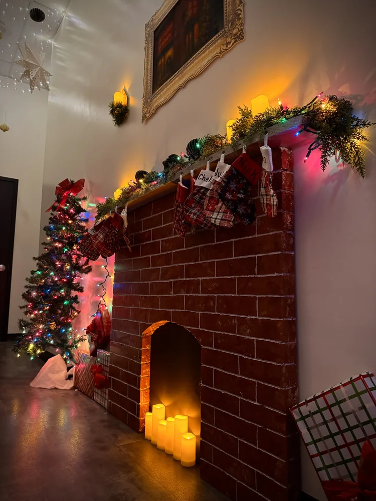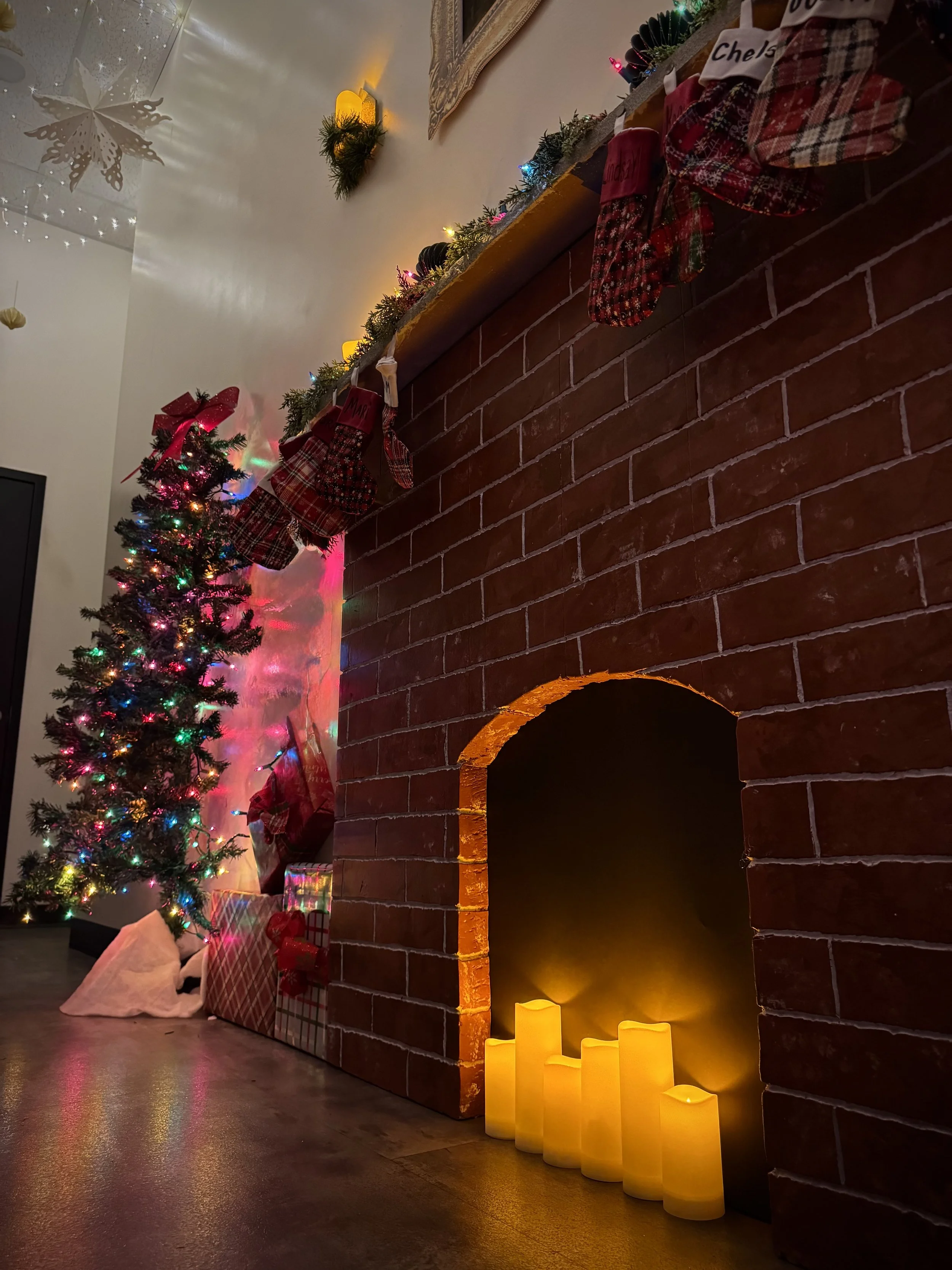 Then, we handcrafted a custom fireplace with personalized trainer stockings and a snowy, storybook-style portrait of the gym’s exterior above the mantle. creating a cozy living-room scene that felt like stepping home for the holidays.