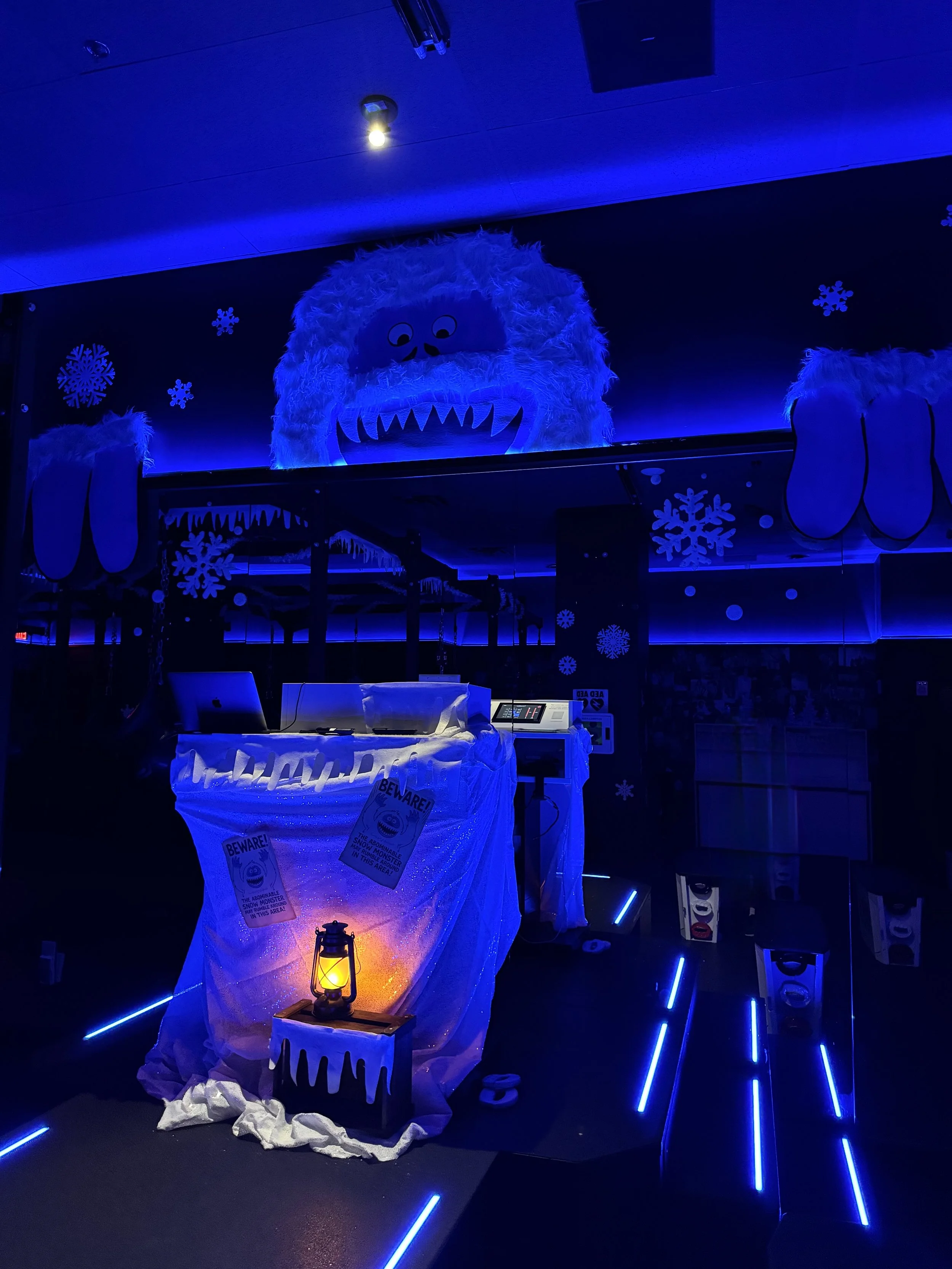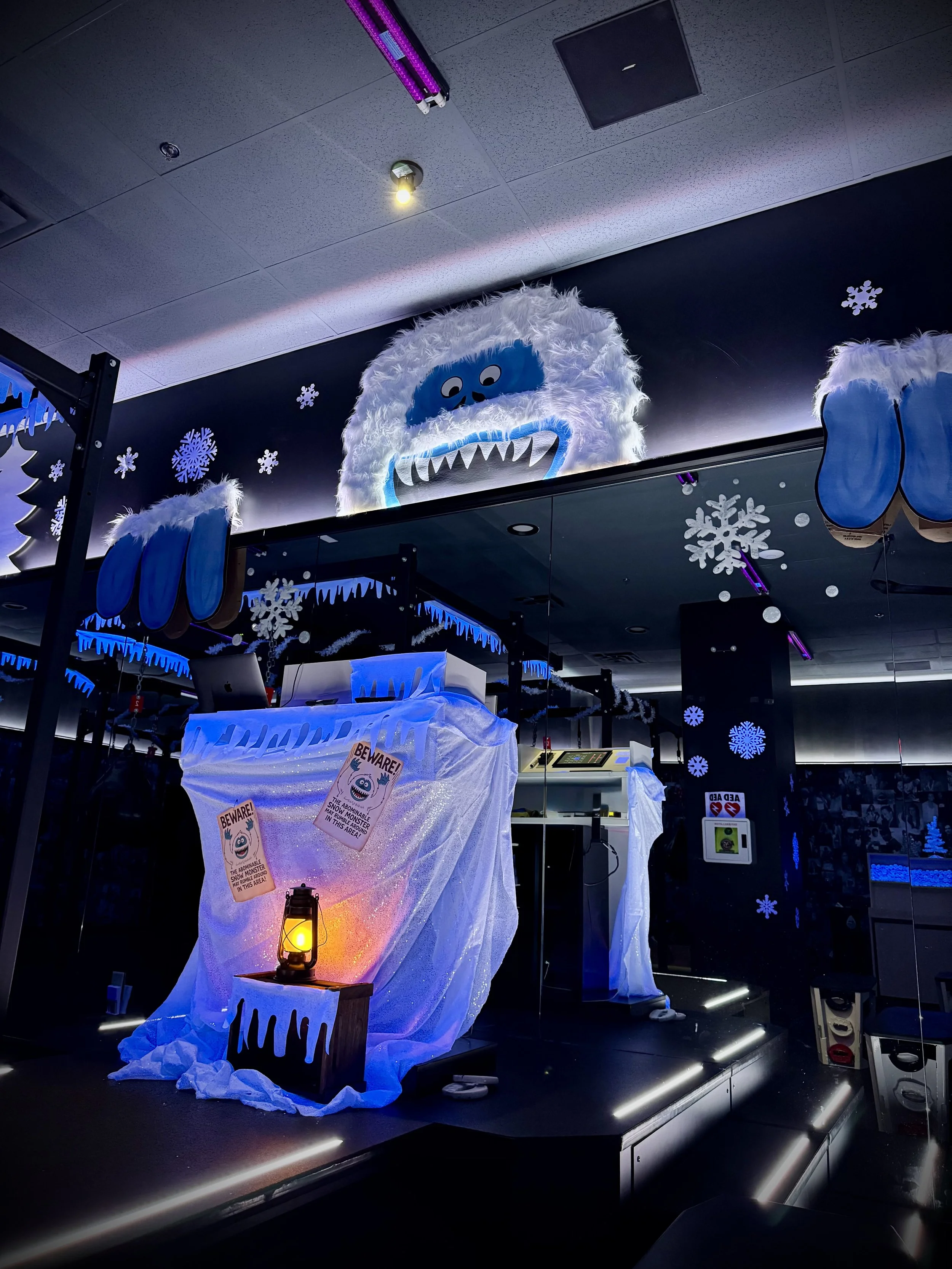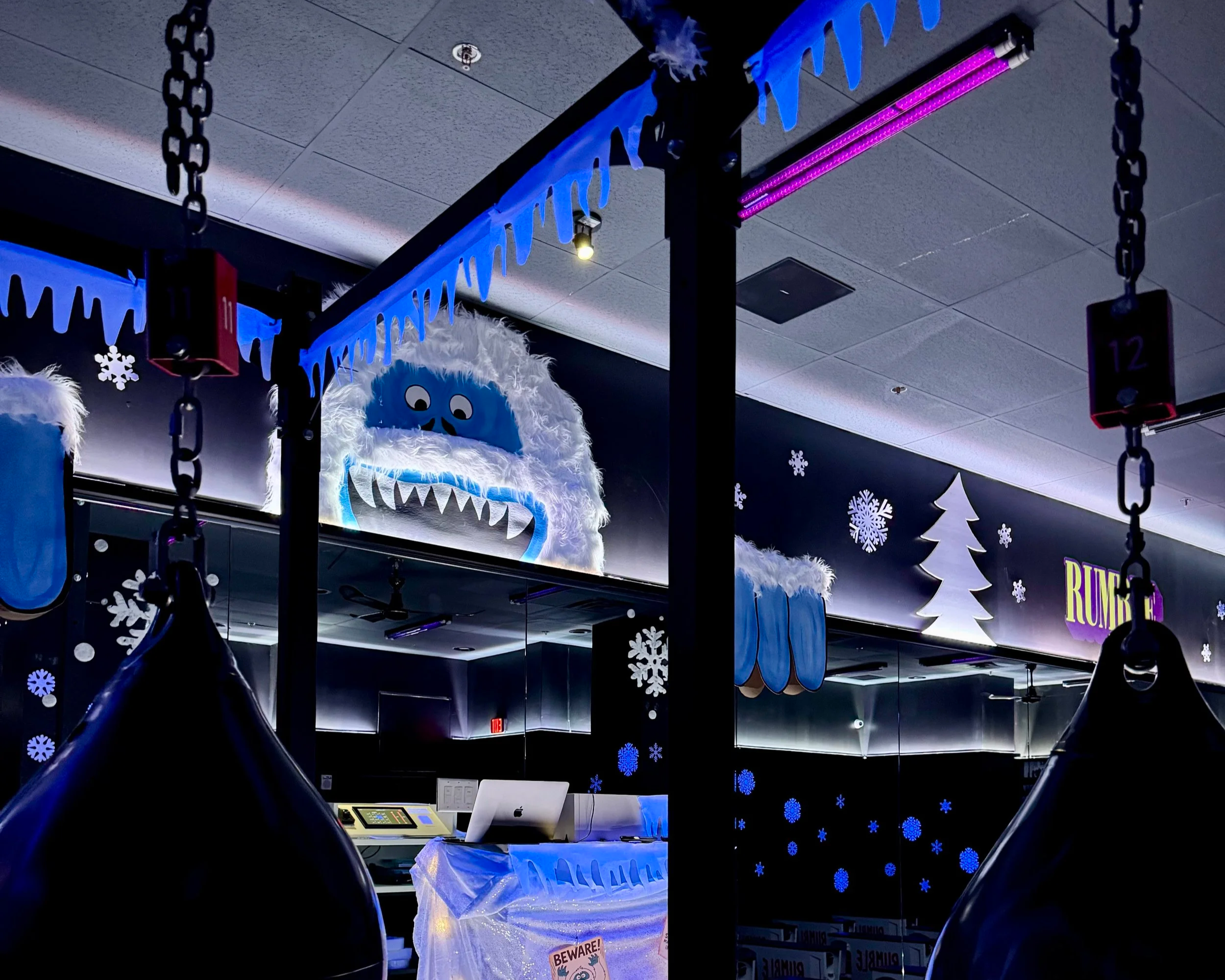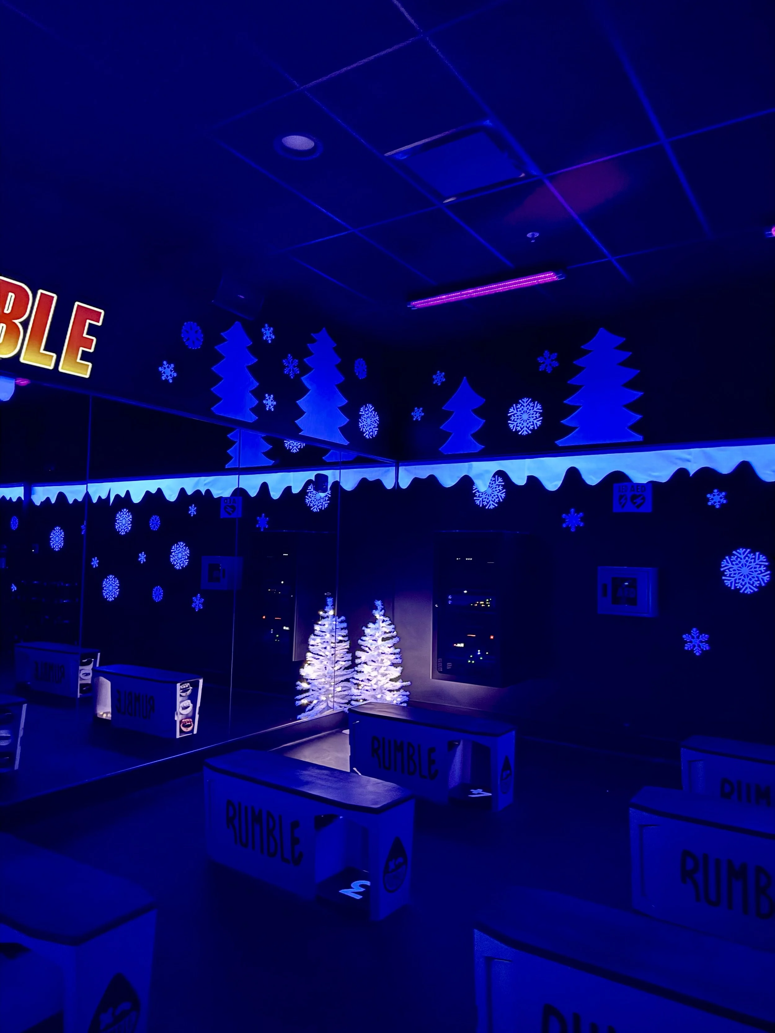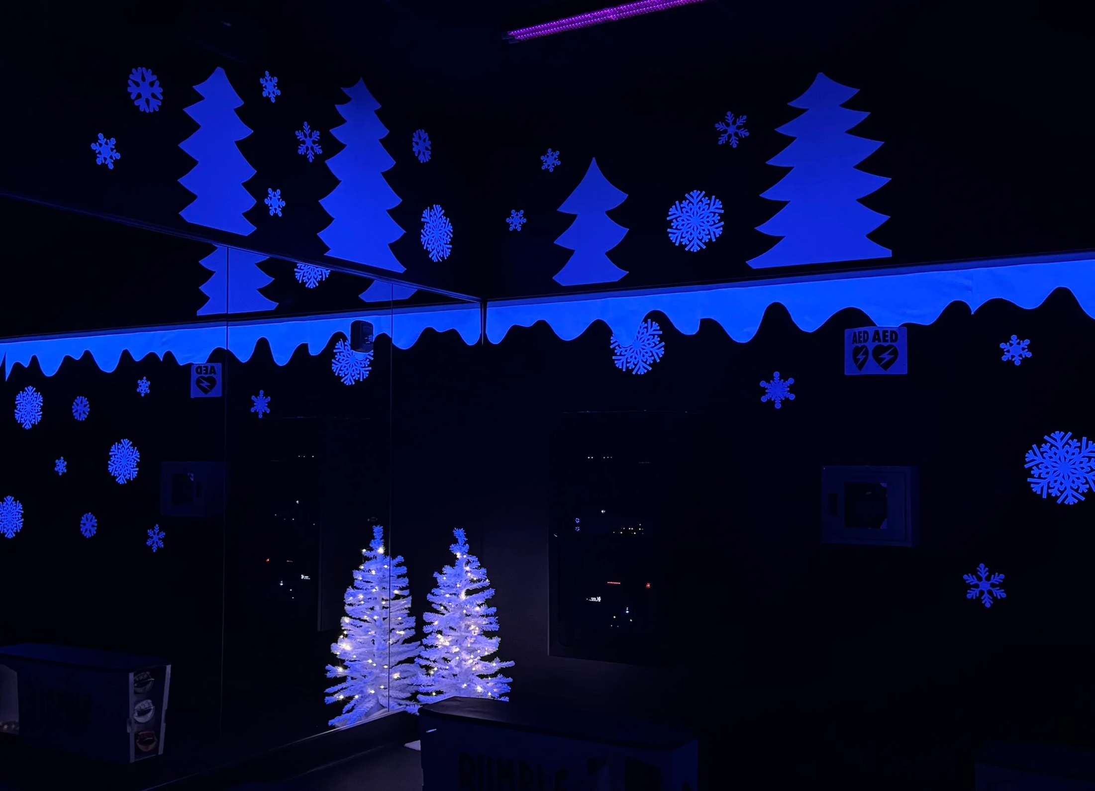 Inside the studio, the narrative shifted. A towering handcrafted Abominable Snow Monster peered over the mirrors while snow-dusted trees and flurries covered the walls. When the blacklights flipped on, the space transformed into a glowing blizzard — turning every workout into a winter storm.