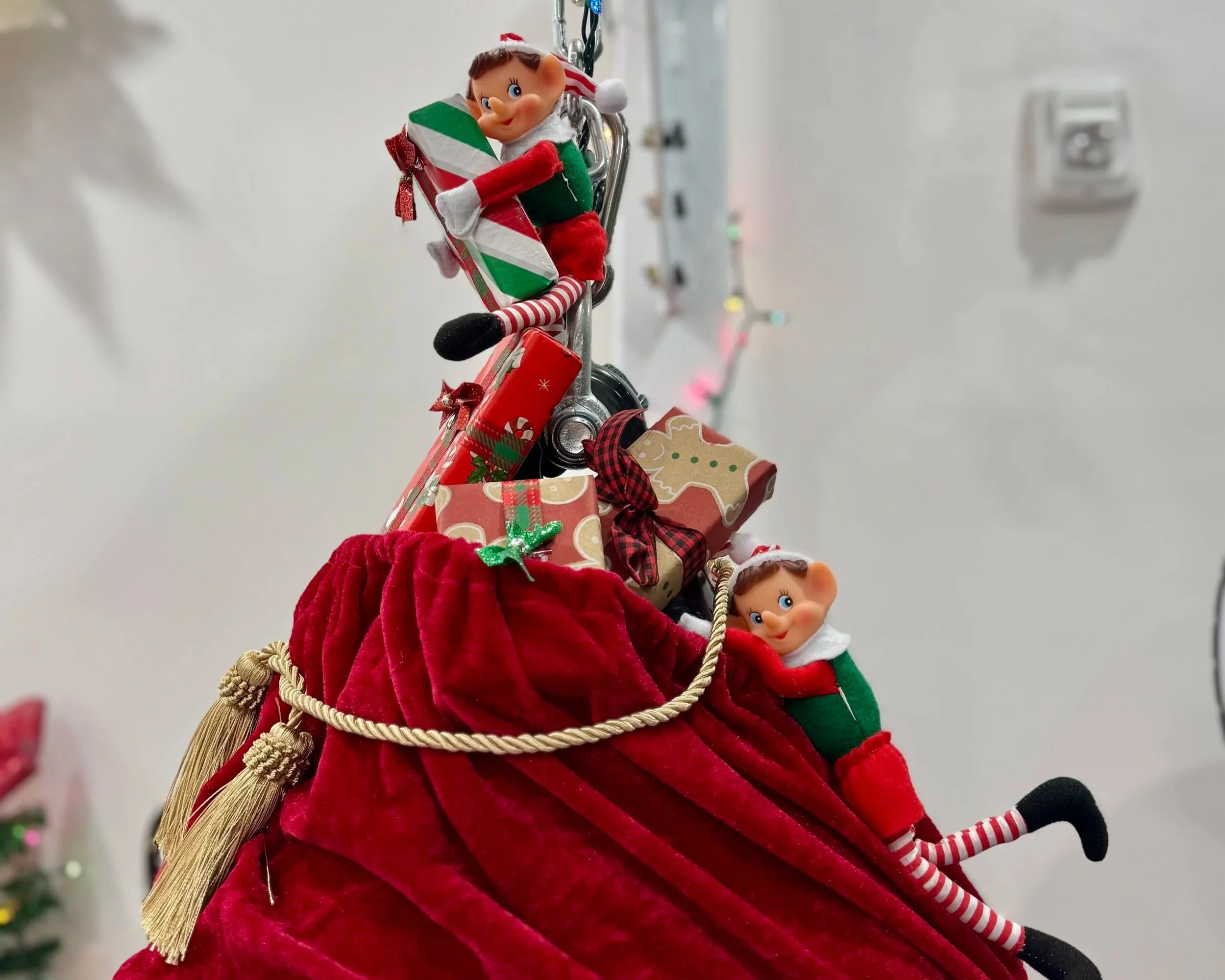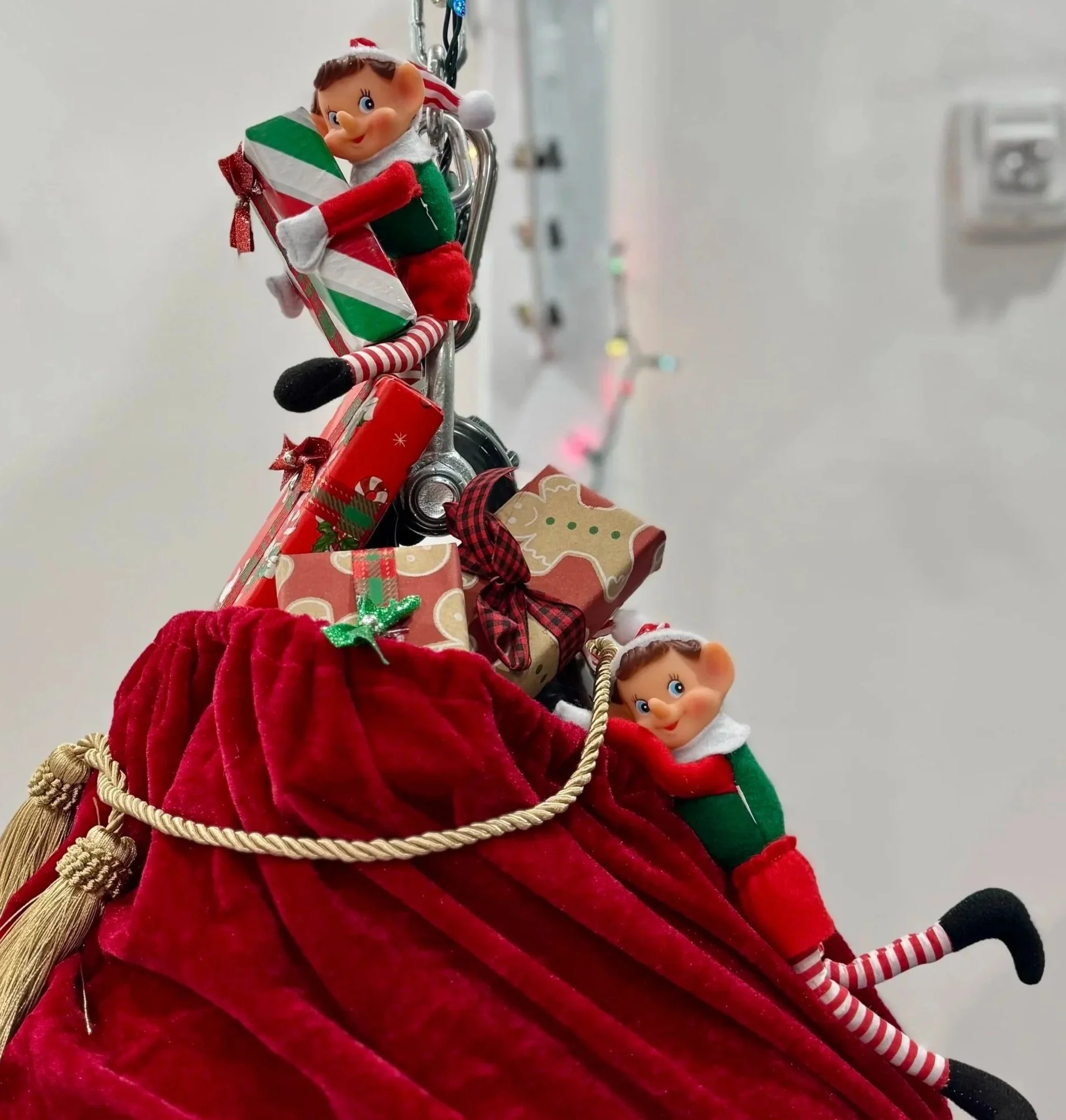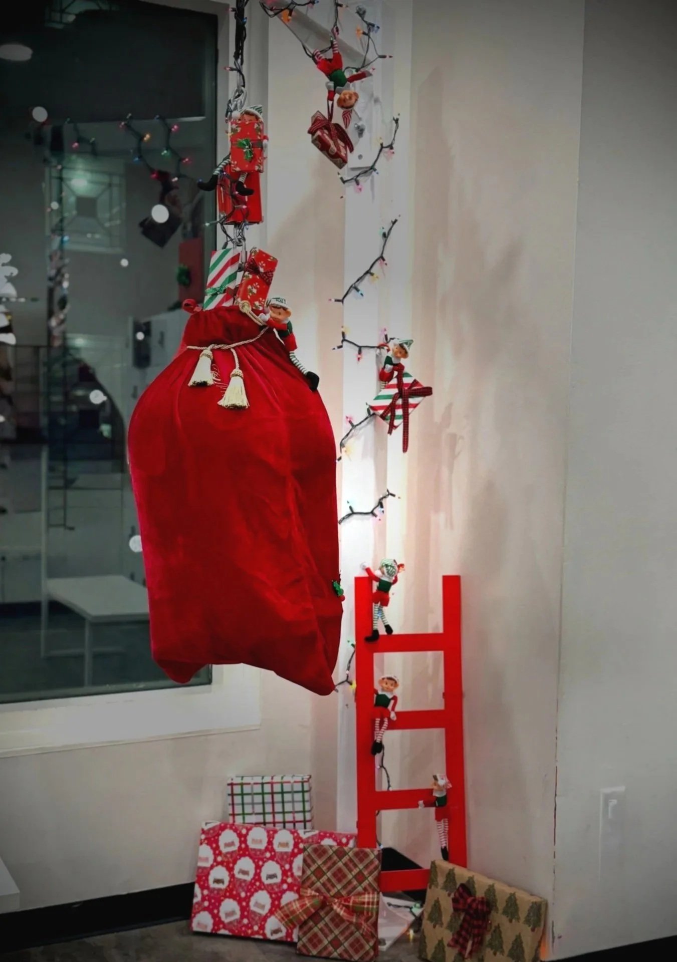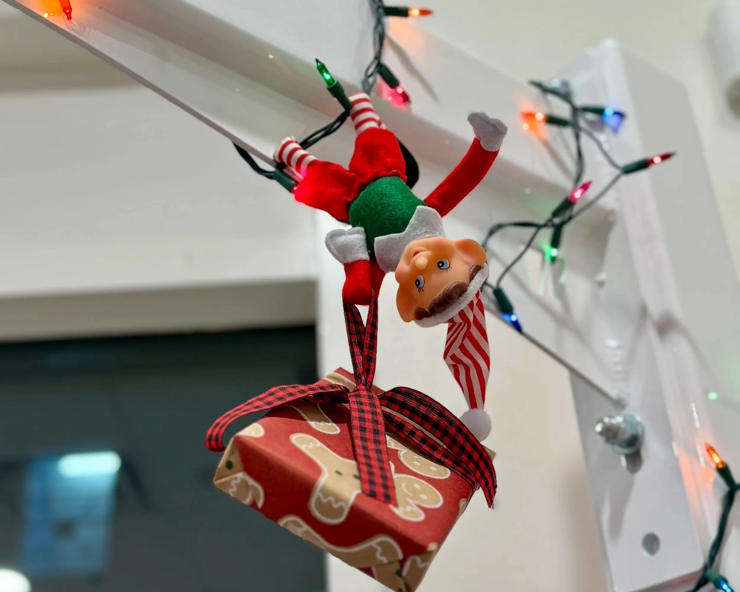 with playful elves mid-delivery— scaling ladders and string lights to load up presents.